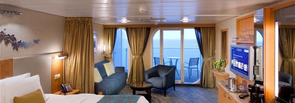 - 客舱内有落地玻璃门,直达私人阳台,两张单人床可转换为大号床,衣柜的空间相当大,带淋浴的私人浴室,沙发床。每个客舱有专属纯平电视,恒温控制空调,宽带上网,直拨电话,收音机,冰箱,个人保险箱及24小时客房服务。