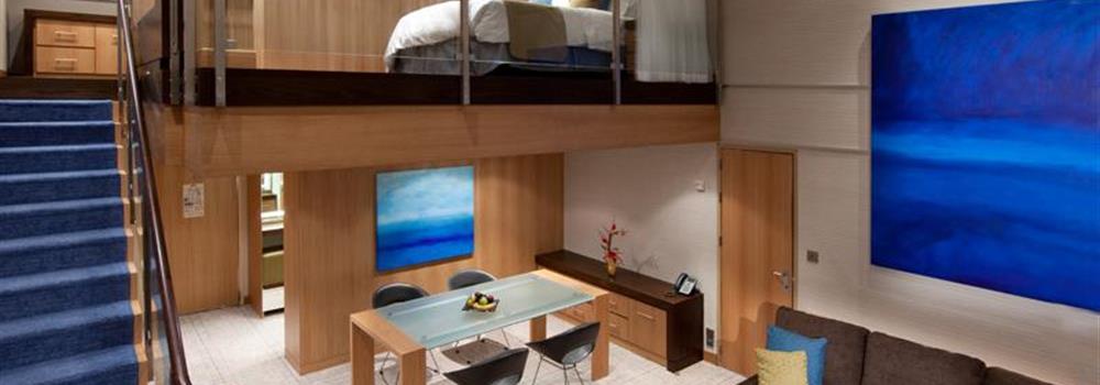 - 客舱内有两张床可转换为大床,衣柜的空间大,带淋浴的私人浴室,书桌,带沙发的客厅。每个客舱有专属的纯平电视,恒温控制空调,宽带上网,直拨电话,收音机,迷你酒吧,个人保险箱及24小时客房服务。